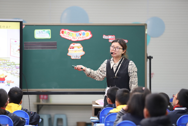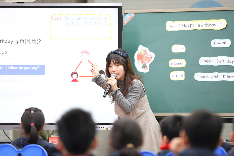 第二节课,来自莲花实验小学的的胡金娣老师同课异构,也展示了Lead in和Cartoon time板块的教学。胡老师通过歌曲进行自我介绍,并导入主题。热身活动后,胡老师通过情境创设、活动设计和有效提问,引导学生由浅入深地对课文内容进行思考和学习。课堂采用“听、说、看、做”多感官结合的方式,通过实物展示、游戏和学生角色表演等环节,帮助学生在真实语境中理解文本,强化语用技能。表演环节结束后,学生们通过创编chant,在欢快的节奏中应用所学句型,胡老师紧扣生日的主题,引导学生从cake、wish到love的情感升华,学生不仅体验了生日时的喜悦,也学会了在他人生日时传递自己的爱与关心。