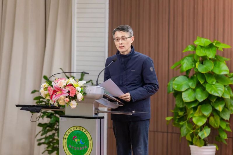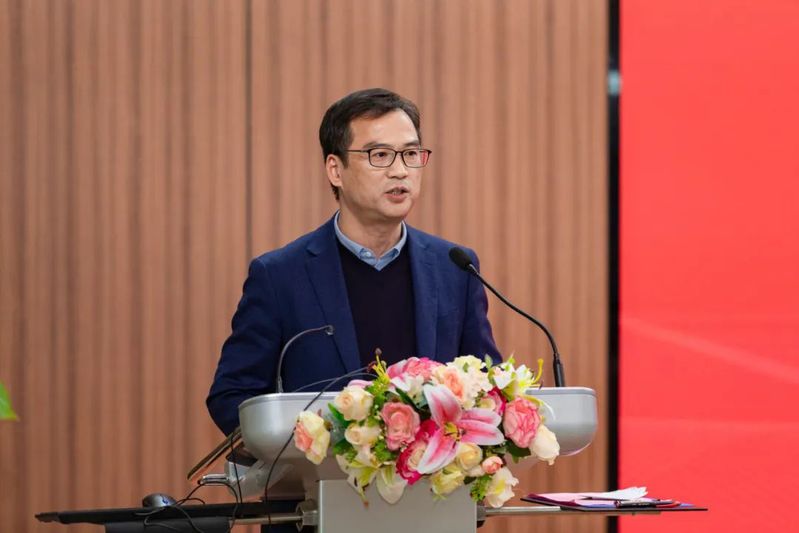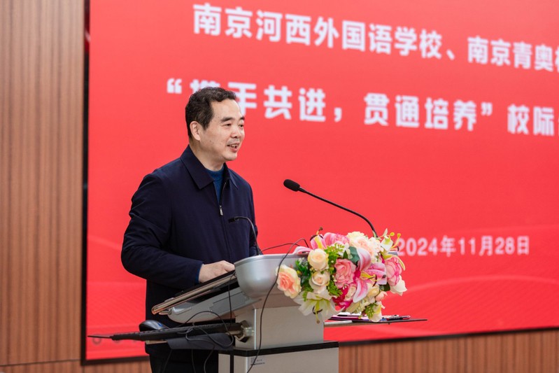 南京外国语学校河西教育集团副理事长易善平致辞。他强调了两校合作的背景和深远意义,介绍了“四贯一通”的创新举措和育人目标,表示南外河西教育集团将积极构建坚实的保障体系,为两校的合作保驾护航。