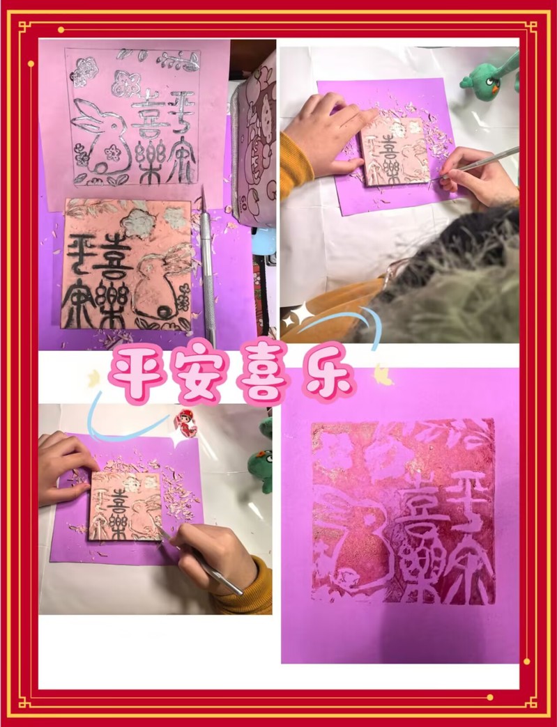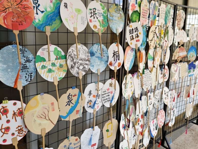 六年级的同学们则通过篆刻和创意书法团扇,将汉字之美展现得淋漓尽致。他们一笔一划地刻出汉字,拂去岁月的烟尘,让汉字文明的故事在指尖流淌。这些作品不仅彰显了孩子们的书写功底,更传递了对传统文化的无限敬仰与传承。