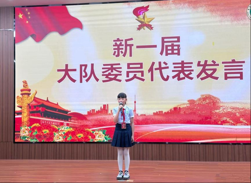 大队委代表陈秋伊作为大队委代表进行发言,她承诺,全体大队委员将以身作则,团结带领广大少先队员,在星星火炬的照耀下,勤奋学习、快乐生活、全面发展,努力为红领巾增添新的光彩,让学校的少先队事业在新的一年里再上新台阶!