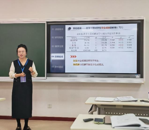 在这样的教研土壤滋养下,魏老师立足小学英语教学一线,充分吸纳教研组实践智慧,潜心钻研并探索形成了“支持-交互式教学”实践模式。此次她以《支持-交互式教学促进小学生英语学习投入的实践研究》为题,系统分享了该模式的构建思路与实施路径。发言中,魏老师重点阐述了如何精准对接小学生英语学习认知特点与实际需求,以多样化语言实践活动为载体,为学生提供情感激励、学业帮扶、社交引导等多维度支持,通过深化师生互动、生生协作乃至人机协同,助力学生沉浸式参与学习过程。为科学验证实践效果,她开展教学实验,采用多因素混合设计的方差分析,持续追踪不同教学场景、不同层次学生的学习表现,最终以详实的数据印证了该模式在提升学生英语学习投入度、增强师生与同伴支持感知、提高学习质量等方面的积极成效,得到了现场同行的关注与认可。